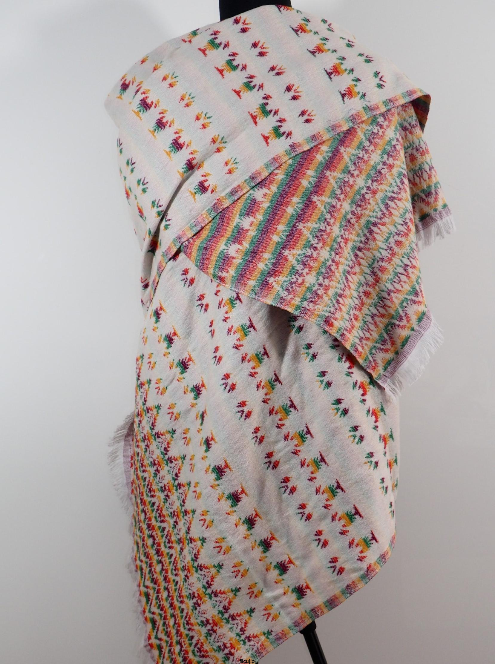 Piękny kolorowy szal dwustronny to niezastąpiony dodatek damskiej stylizacji podczas chłodnych dni jesienią, zimą i wiosną. Zarzucone na ramiona lub zamotane w fantazyjny węzeł zastąpią cieplejszy sweter a zarazem dając urok. Duży kremowy damski szal we wzory azteckie w odcieniach pomarańczowym, żółtym i czarnym ze 100% wełny z merynosów australijskich. Azteckie wzory doskonale podkreślą indywidualny wygląd etno, boho, hippie kreacji i nada niepowtarzalnego szyku. Bardzo często używane są jako przykrycie lub kocyk podczas medytacji.