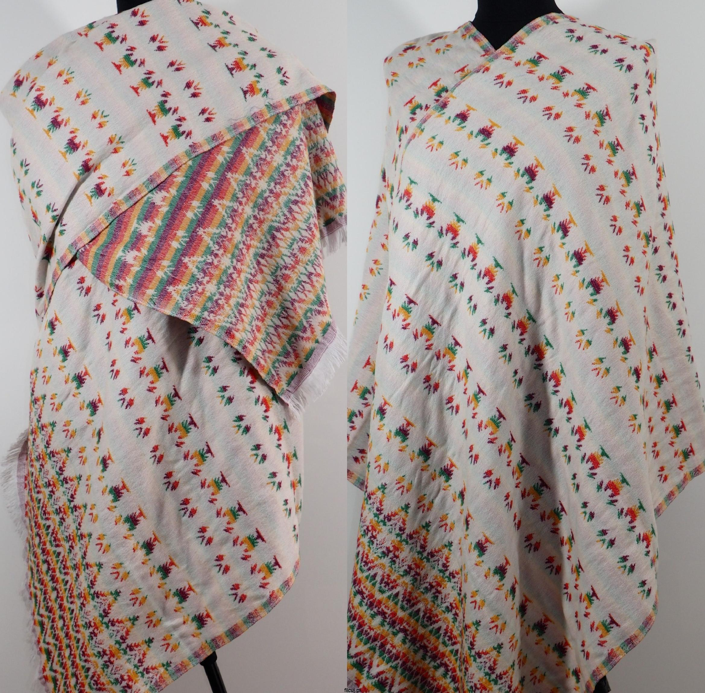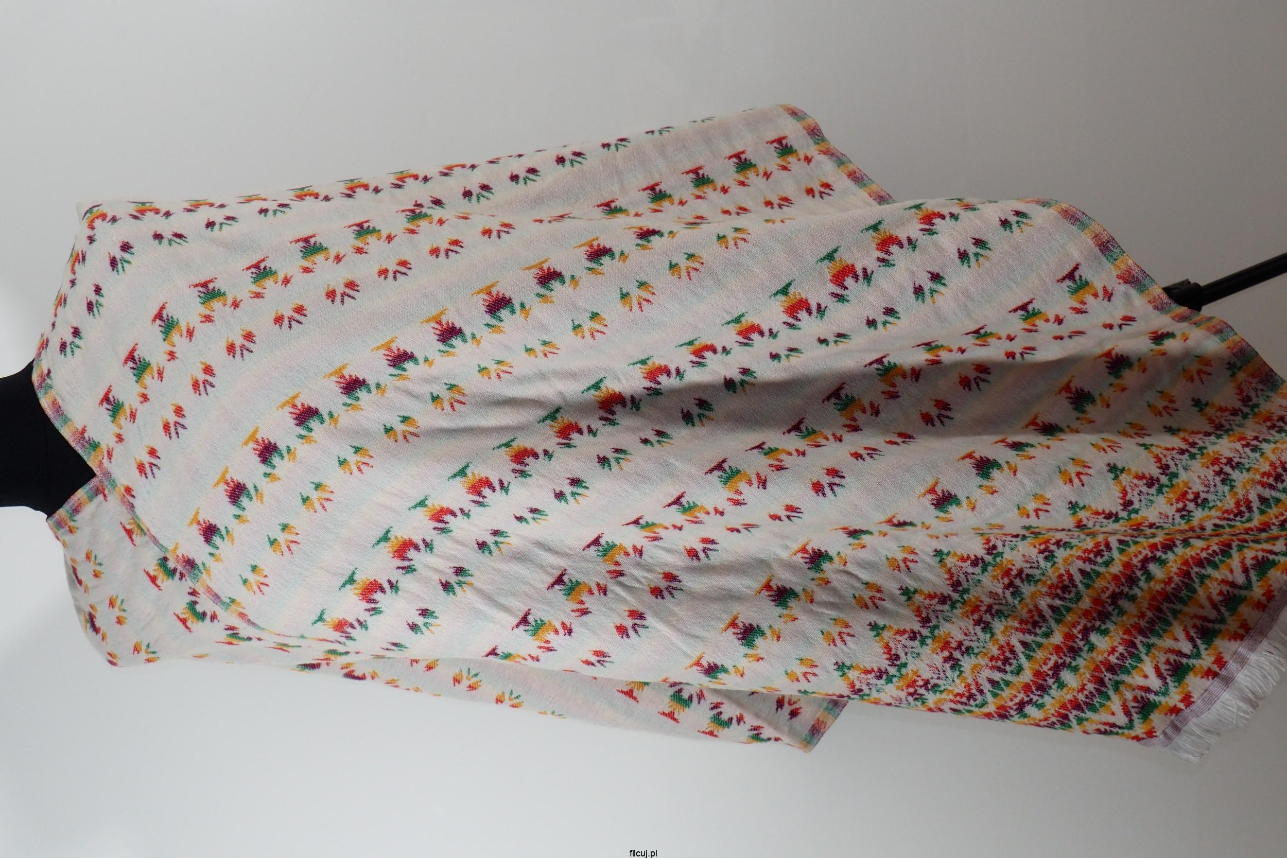 Piękny kolorowy szal dwustronny to niezastąpiony dodatek damskiej stylizacji podczas chłodnych dni jesienią, zimą i wiosną. Zarzucone na ramiona lub zamotane w fantazyjny węzeł zastąpią cieplejszy sweter a zarazem dając urok. Duży kremowy damski szal we wzory azteckie w odcieniach pomarańczowym, żółtym i czarnym ze 100% wełny z merynosów australijskich. Azteckie wzory doskonale podkreślą indywidualny wygląd etno, boho, hippie kreacji i nada niepowtarzalnego szyku. Bardzo często używane są jako przykrycie lub kocyk podczas medytacji.