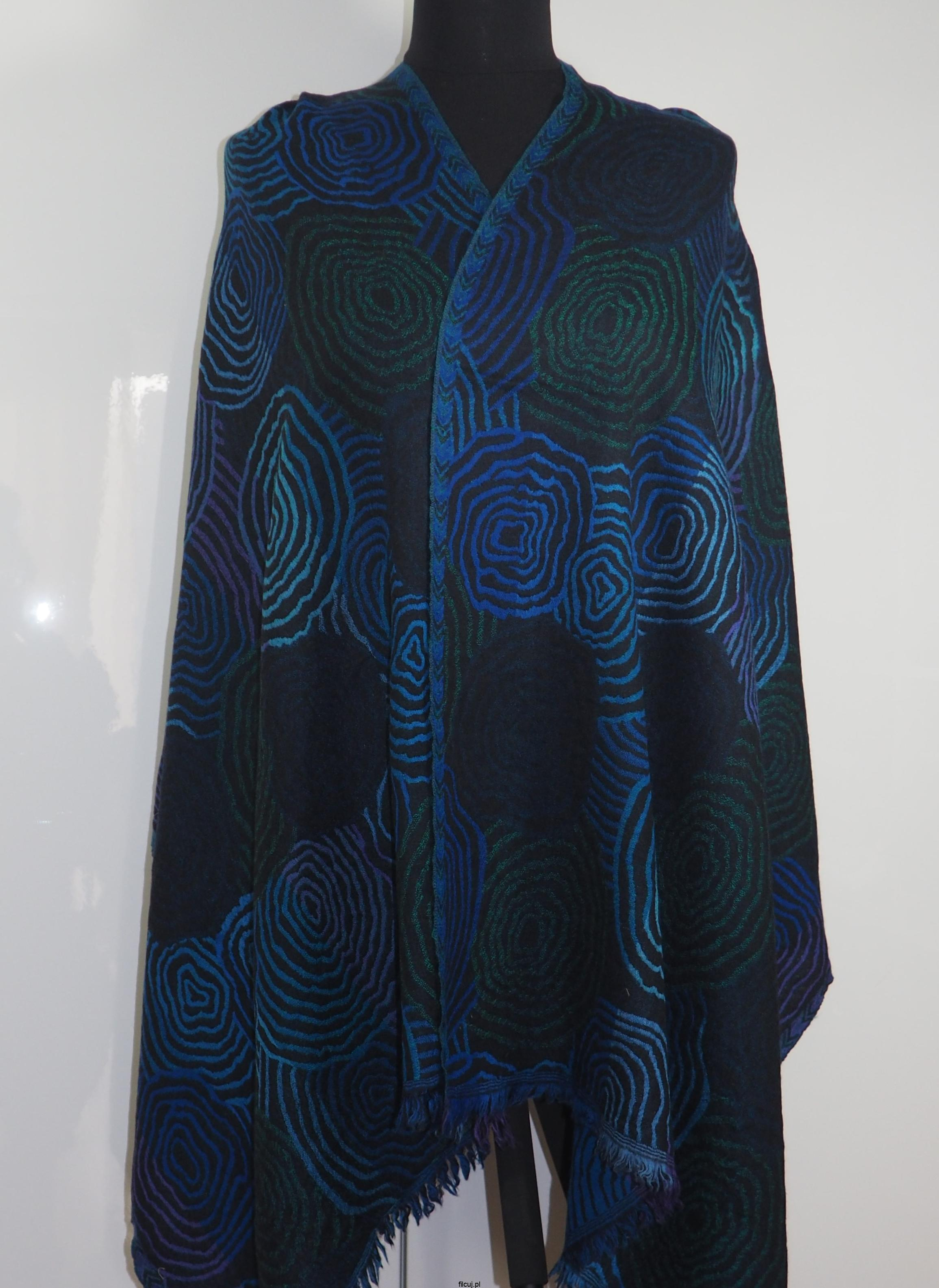 Granatowy szal w połączeniu z niebieskim i innymi odcieniami granatu świetnie współgrają geometrycznymi wzorami.