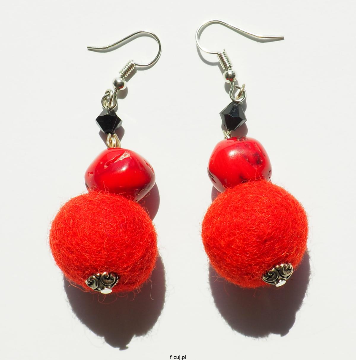 Kolczyki filcowe w kolorze czerwonym, wykonane z wysokogatunkowej wełny merynosów z Nowej Zelandii w połączeniu z kamieniem w podobnym kolorze.