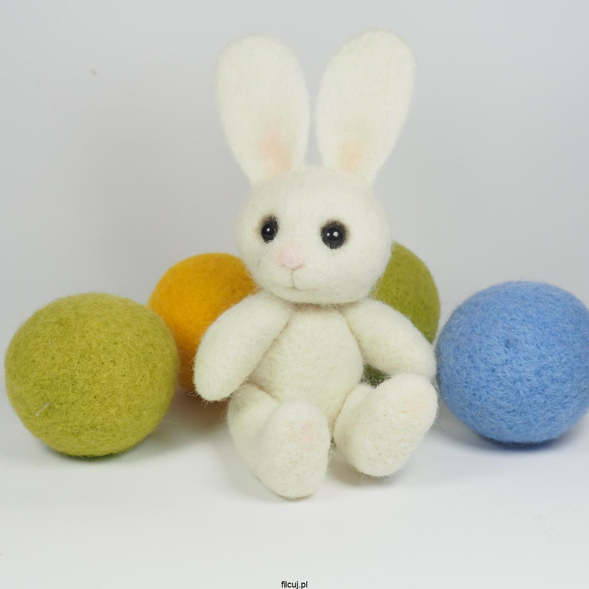 Uroczy biały królik baby z ruchomymi łapkami została wykonany z naturalnej owczej wełny merynosów z Nowej Zelandii. Ręcznie robione techniką suchego filcowania za pomocą igły.