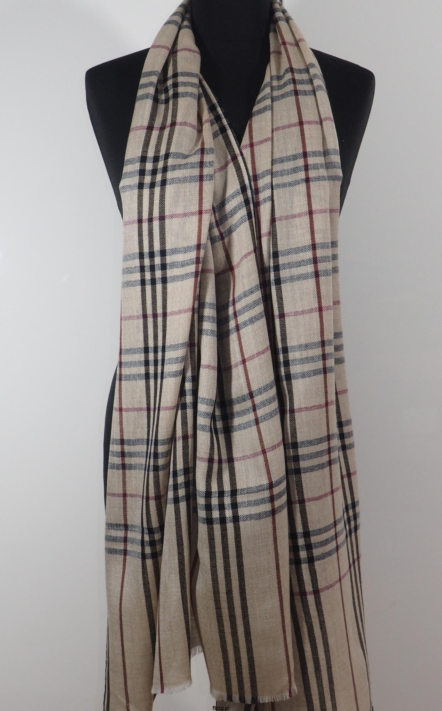 Bardzo elegancki dwustronny duży szal z wełny merynosów, połączony z jedwabiem. Beżowy podstawowy kolor szalu doskonale współgra z klasyczną angielską kratkę w odcieniach brązu i bordo. Włókna jedwabne nadają delikatności i lekkości o naturalnym połysku. Wełna daje przyjemne odczucie ciepła. Nowoczesny dizajn powoduje, iż przeznaczony tak dla Pań jak i dla Panów. Doskonale nada się na ciepłe i zimniejsze jesienne-zimowe dni.