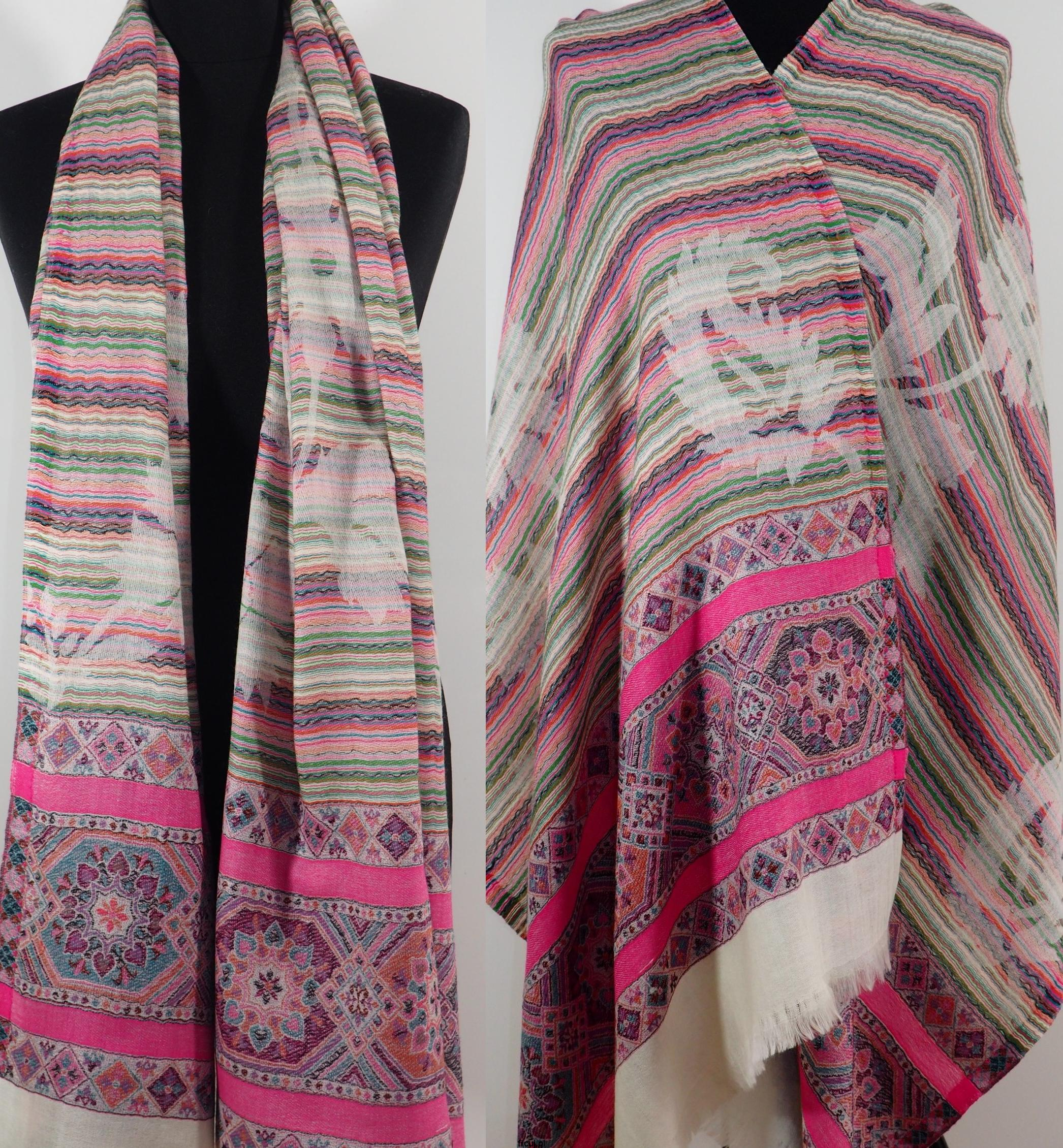 Elegancki i piękny szal dwustronny z wełny merynosów to niezastąpiony dodatek damskiej stylizacji podczas chłodnych dni jesienią, zimą i wiosną. Zarzucone na ramiona lub zamotane w fantazyjny węzeł zastąpią cieplejszy sweter a zarazem dając urok. Duży damski kremowo różowy szal w kolorowe paski i wzory azteckie doskonale podkreśli indywidualny wygląd etno, boho, hippie kreacji i nada niepowtarzalnego szyku.