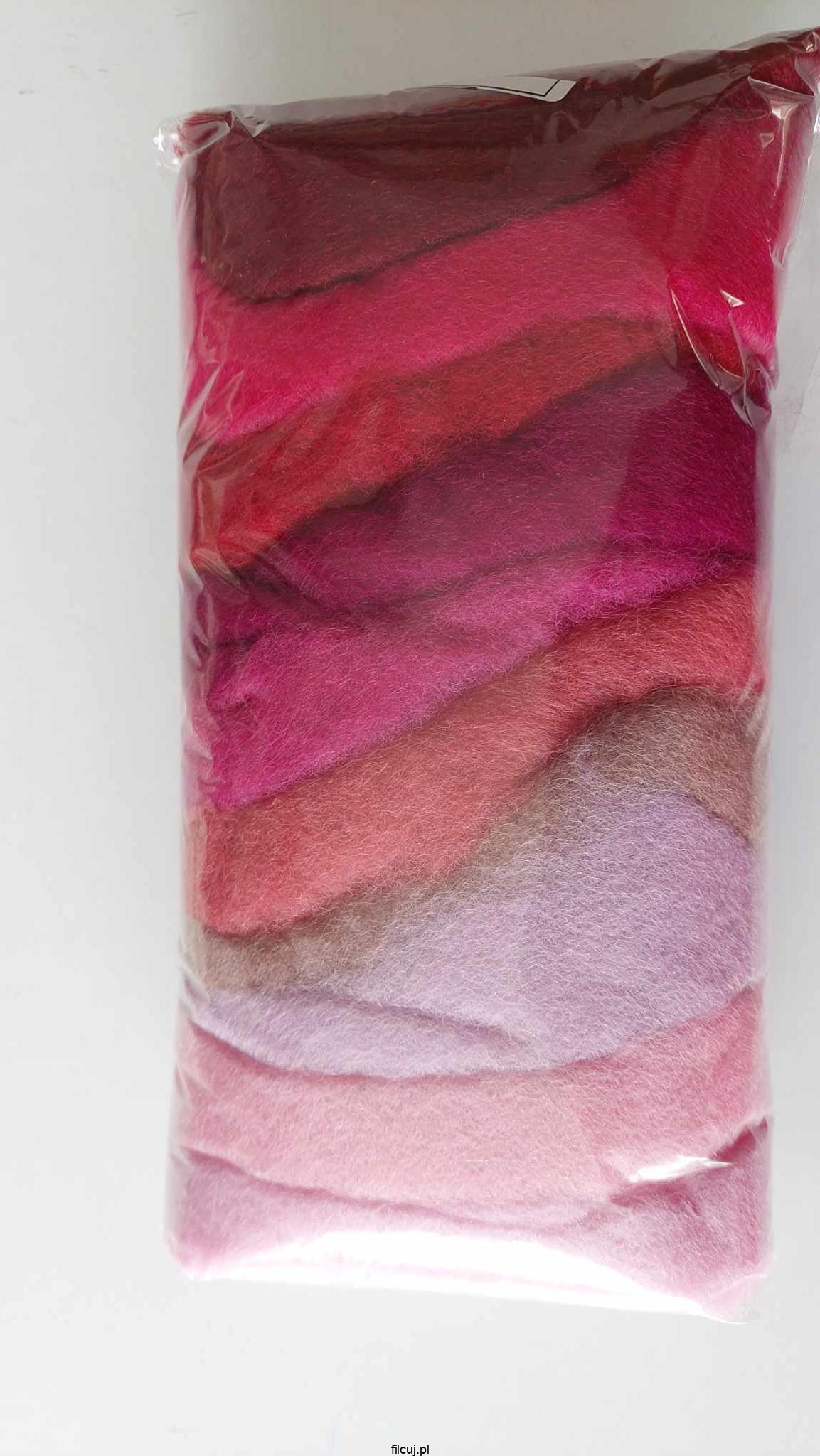 Zestaw odcienie RÓŻU wełna zgrzebnej w błamie z merynosów nowozelandzkich (Кардочес новозеландский) są o grubości włókna ok. 27 μ.